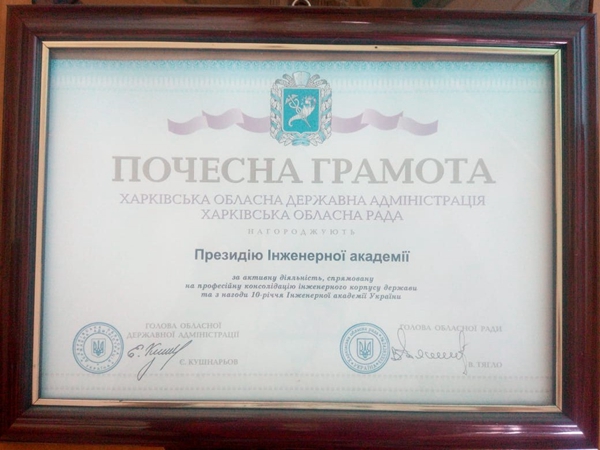 乌克兰国家工程院院士、KP“哈尔科夫地铁”副总经理、“乌克兰功勋建设工作者”、哈尔科夫前市长